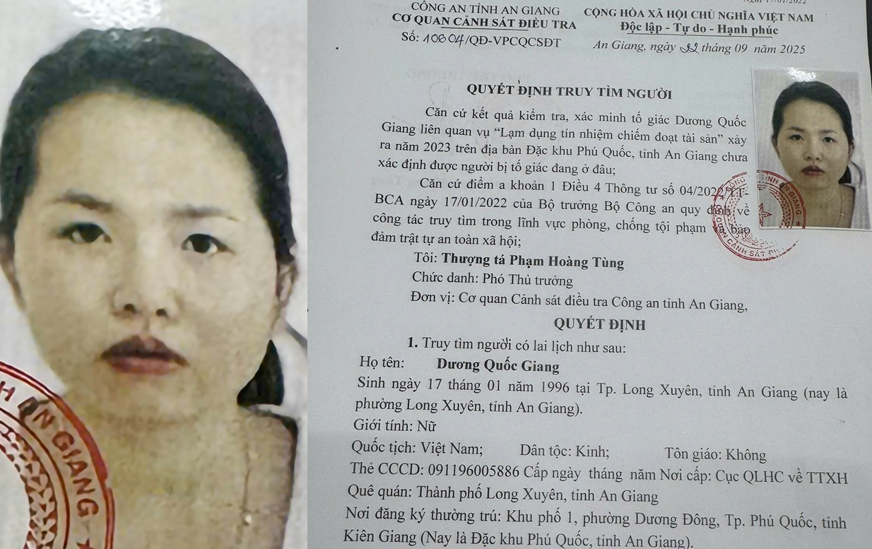 Sáng 24/9, Cơ quan Cơ quan Cảnh sát điều tra (CSĐT) Công an tỉnh An Giang cho biết, vừa ra quyết định truy tìm đối tượng Dương Quốc Giang, sinh năm 1996 (cư trú tại đặc khu Phú Quốc, tỉnh An Giang) để phục vụ công tác điều tra vụ án “Lạm dụng tín nhiệm chiếm đoạt tài sản”.