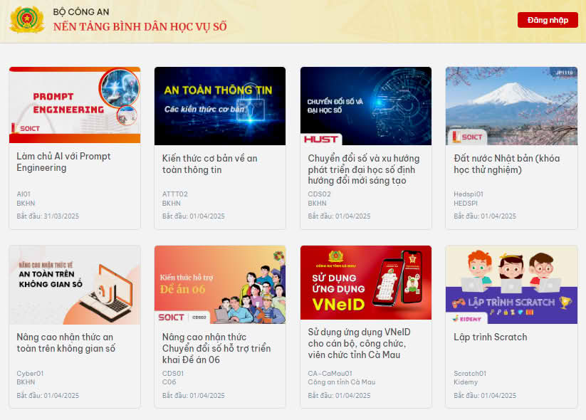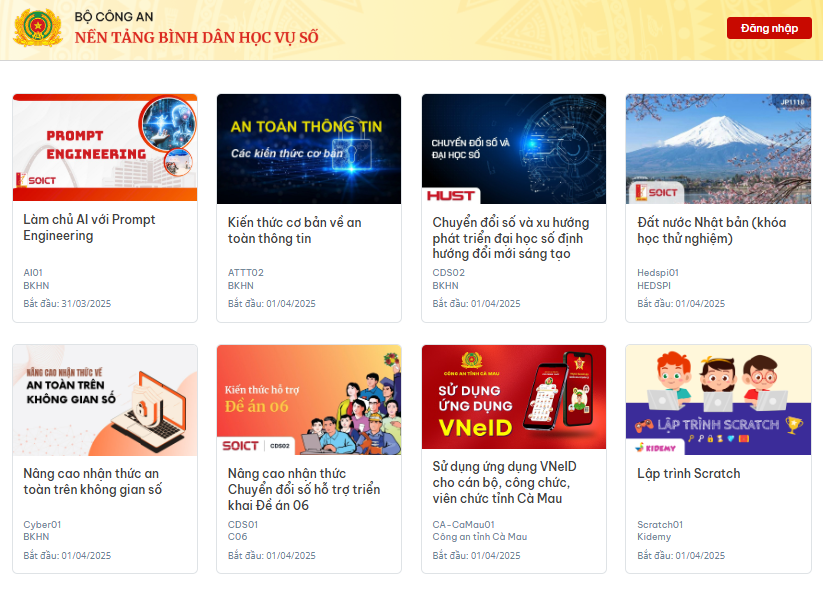 Nền tảng https://binhdanhocvuso.gov.vn cung cấp hệ thống khóa học phong phú, phù hợp với tất cả các đối tượng như: Trẻ em, học sinh có khóa học: “Lập trình Scratch” giúp làm quen tư duy công nghệ qua trò chơi sinh động rèn luyện tư duy logic. Dành cho người học phổ thông hoặc sinh viên có khóa: “Phổ cập kỹ năng số” và “Nhận diện tin giả”, “Làm chủ AI với Prompt Engineering”. Người đi làm, cán bộ văn phòng có khóa học: “Chuyển đổi số trong đại học”, “Nâng cao nhận thức an toàn trên không gian số”, “Bảo vệ an toàn thông tin cá nhân”. Người dân chuẩn bị thi lái xe học về: “600 câu hỏi lý thuyết lái xe ô tô”, “Kỹ thuật lái xe”, “Đạo đức người lái xe, văn hóa giao thông”; cho cán bộ công an, cán bộ các sở, ban, ngành có khóa học riêng về: “Nâng cao nhận thức chuyển đổi số hỗ trợ triển khai Đề án 06”. Ngoài ra, nền tảng còn: Hướng dẫn sử dụng máy tính, thiết bị thông minh, mạng xã hội, dịch vụ công trực tuyến; cấu tạo và sửa chữa thông thường xe ô tô; Cung cấp công cụ tương tác trực tiếp với chính quyền trên môi trường số; tuyên truyền kiến thức an toàn thông tin, bảo mật dữ liệu cá nhân, phòng tránh lừa đảo mạng.