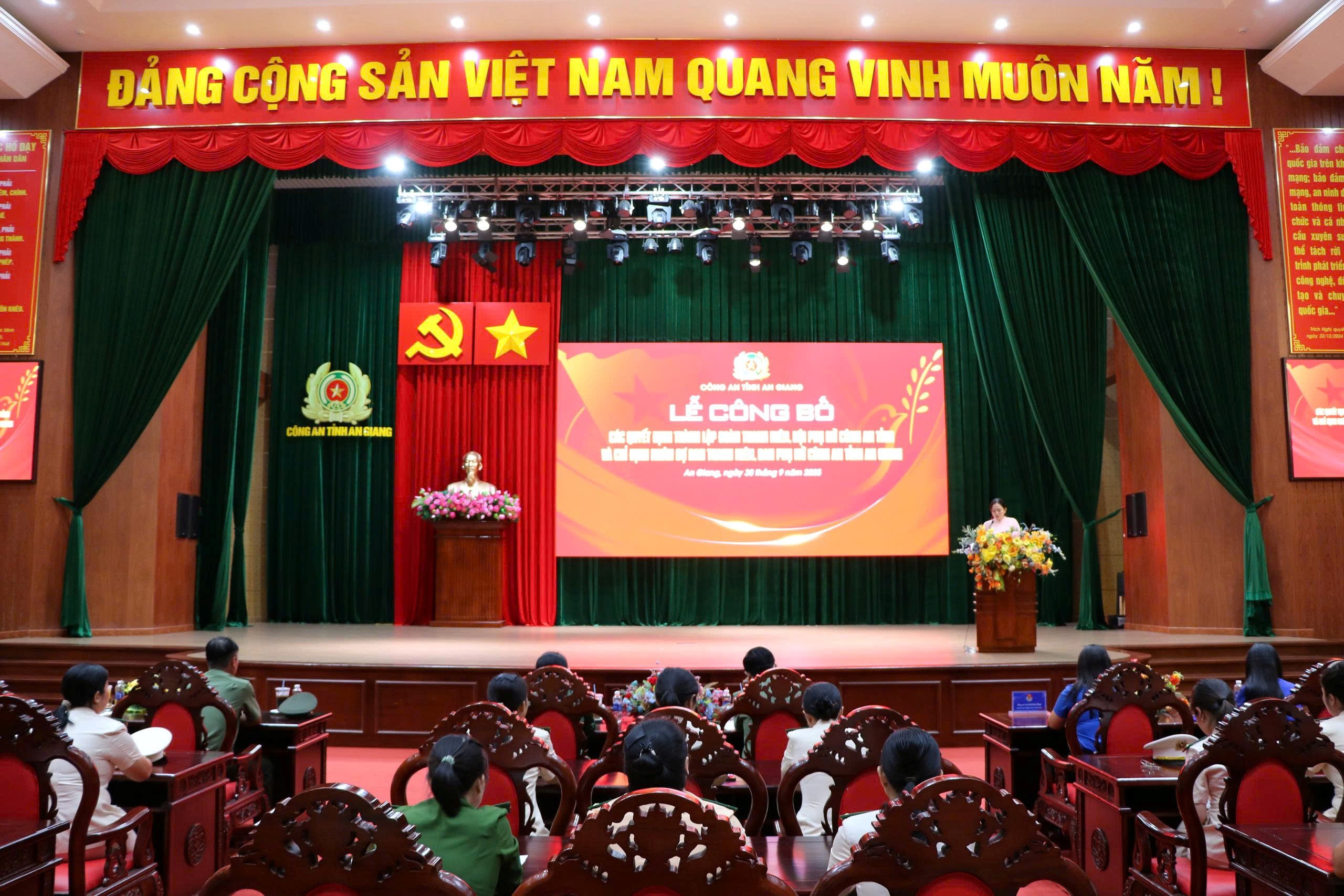 Tại buổi lễ, lãnh đạo Công an tỉnh đã trao các quyết định thành lập Đoàn Thanh niên và Hội Phụ nữ Công an tỉnh; đồng thời chỉ định Ban Chấp hành của hai tổ chức. Đồng chí Trung tá Trương Văn Quốc được chỉ định làm Trưởng Ban thanh niên Công an tỉnh An Giang nhiệm kỳ 2022 – 2027; đồng chí Trung tá Nguyễn Thị Thu Cúc được chỉ định làm Trưởng Ban Phụ nữ Công an tỉnh nhiệm kỳ 2021 – 2026. Đây là dấu mốc quan trọng, khẳng định sự quan tâm, tạo điều kiện của Đảng ủy, Ban Giám đốc Công an tỉnh đối với công tác đoàn thể, góp phần phát huy vai trò xung kích, sáng tạo của tuổi trẻ cũng như sự năng động, trách nhiệm của cán bộ, hội viên phụ nữ trong toàn lực lượng.