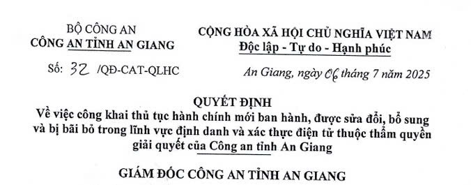 Quyết định số 32/QĐ-CAT-QLHC ngày 06/7/2025 của Công an tỉnh về việc công bố thủ tục hành chính mới ban hành, được sửa đổi, bổ sung và bị bãi bỏ trong lĩnh vực định danh và xác thực điện tử thuộc thẩm quyền giải quyết của Công an tỉnh;