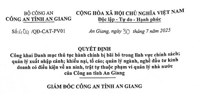 Quyết số 404/QĐ-CAT-PV01 ngày 30/7/2025 của Công an tỉnh về việc công khai Danh mục thủ tục hành chính bị bãi bỏ trong lĩnh vực chính sách; quản lý xuất nhập cảnh; khiếu nại, tố cáo; quản lý ngành, nghề đầu tư kinh doanh có điều kiện về an ninh, trật tự thuộc phạm vi quản lý nhà nước của Công an tỉnh