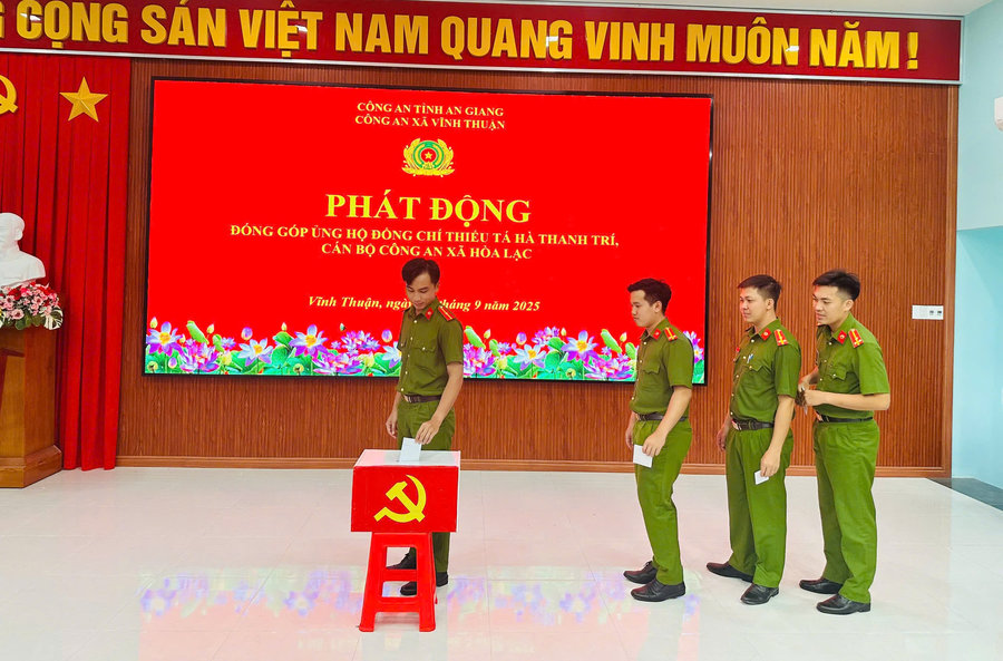 Ngày 16/9/2025, Công an xã Vĩnh Thuận, tỉnh An Giang tổ chức phát động đến toàn thể cán bộ, chiến sĩ trong đơn vị đóng góp ủng hộ đối với Thiếu tá Hà Thanh Trí, cán bộ Công an xã Hòa Lạc có hoàn cảnh khó khăn, mắc bệnh hiểm nghèo.