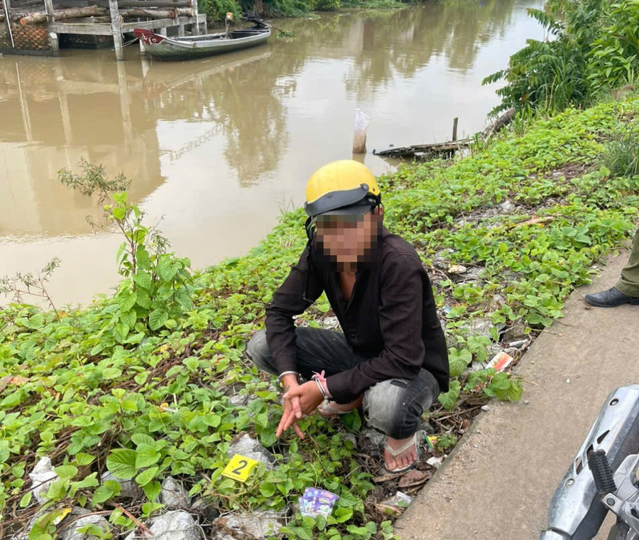 Đối tượng Lê Công Hậu tại hiện trường nơi ném tang vật