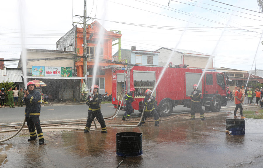 Ngay khi tiếp nhận, Phòng Cảnh sát PCCC và CNCH đã điều động 2 xe chuyên dụng cùng 20 cán bộ, chiến sĩ triển khai dập lửa, cứu người mắc kẹt và di chuyển tài sản đến nơi an toàn. Sau khoảng 15 phút, đám cháy giả định được khống chế hoàn toàn.