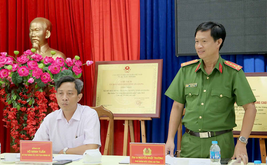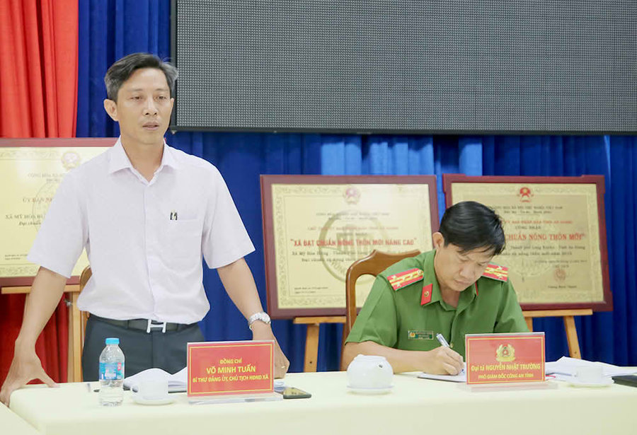 Đại diện lãnh đạo Công an xã Mỹ Hòa Hưng báo cáo kết quả các mặt công tác