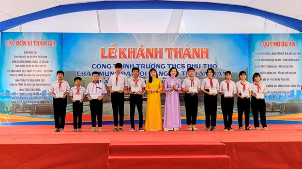 Dịp này, đồng chí Trần Thị Thanh Hương, Phó Bí thư Tỉnh ủy, Trưởng Đoàn đại biểu Quốc hội, Chủ tịch UBMTTQVN tỉnh trao tặng 20 suất học bổng đến các em học sinh giỏi, có hoàn cảnh khó khăn, trị giá mỗi suất 1 triệu đồng. Các đơn vị tham gia xây dựng công trình Trường Trung học cơ sở Phú Thọ đồng tài trợ 35 suất bảo hiểm y tế, mỗi suất trị giá 632 ngàn đồng cho học sinh hoàn cảnh khó khăn.
