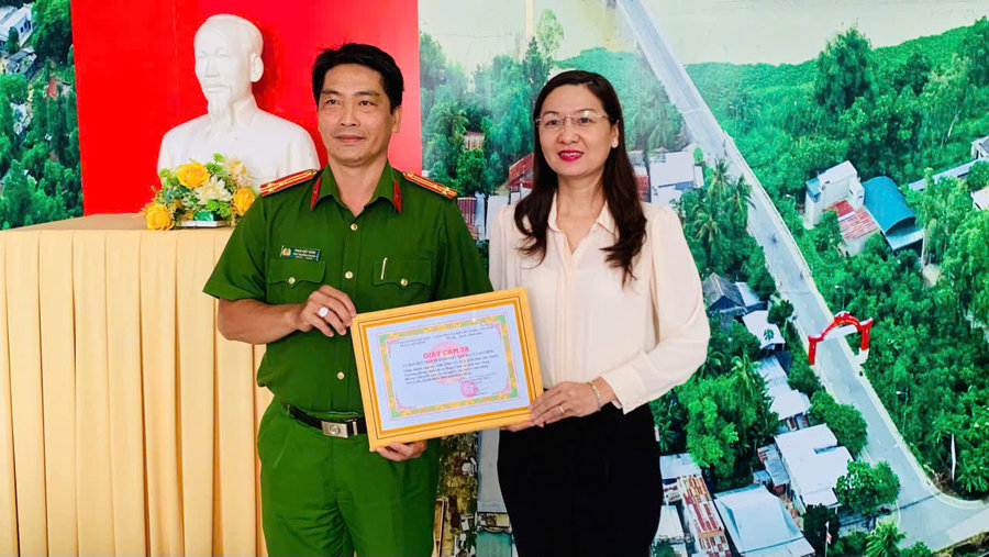 Đồng chí Trần Phan Như Ý, Chủ tịch UBMTTQ xã trao thư cảm ơn cho đồng chí Thượng tá Phạm Việt Hùng, Phó Trưởng phòng Cảnh sát cơ động
