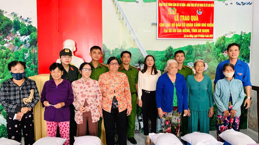 Ngày 19/9/2025, Đoàn cơ sở Phòng Cảnh sát cơ động phối hợp với Đoàn Thanh niên xã Cù Lao Giêng tổ chức Lễ trao quà cho các hộ dân có hoàn cảnh khó khăn trên địa bàn xã Cù Lao Giêng, tỉnh An Giang. Tham dự có đồng chí Thượng tá Phạm Việt Hùng, Phó Trưởng phòng Cảnh sát cơ động, đồng chí Trần Phan Như Ý, Chủ tịch UBMTTQ xã, cùng cán bộ chiến sĩ Phòng Cảnh sát cơ động và đoàn viên thanh niên xã Cù Lao Giêng.