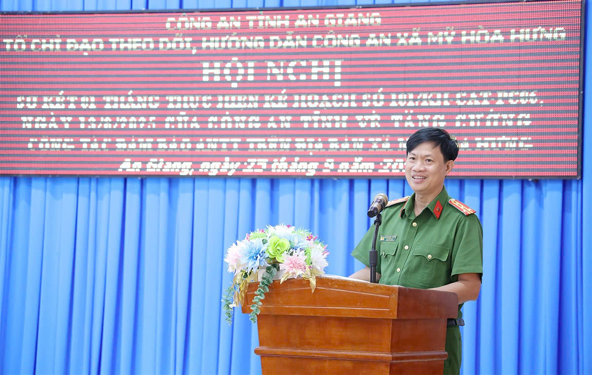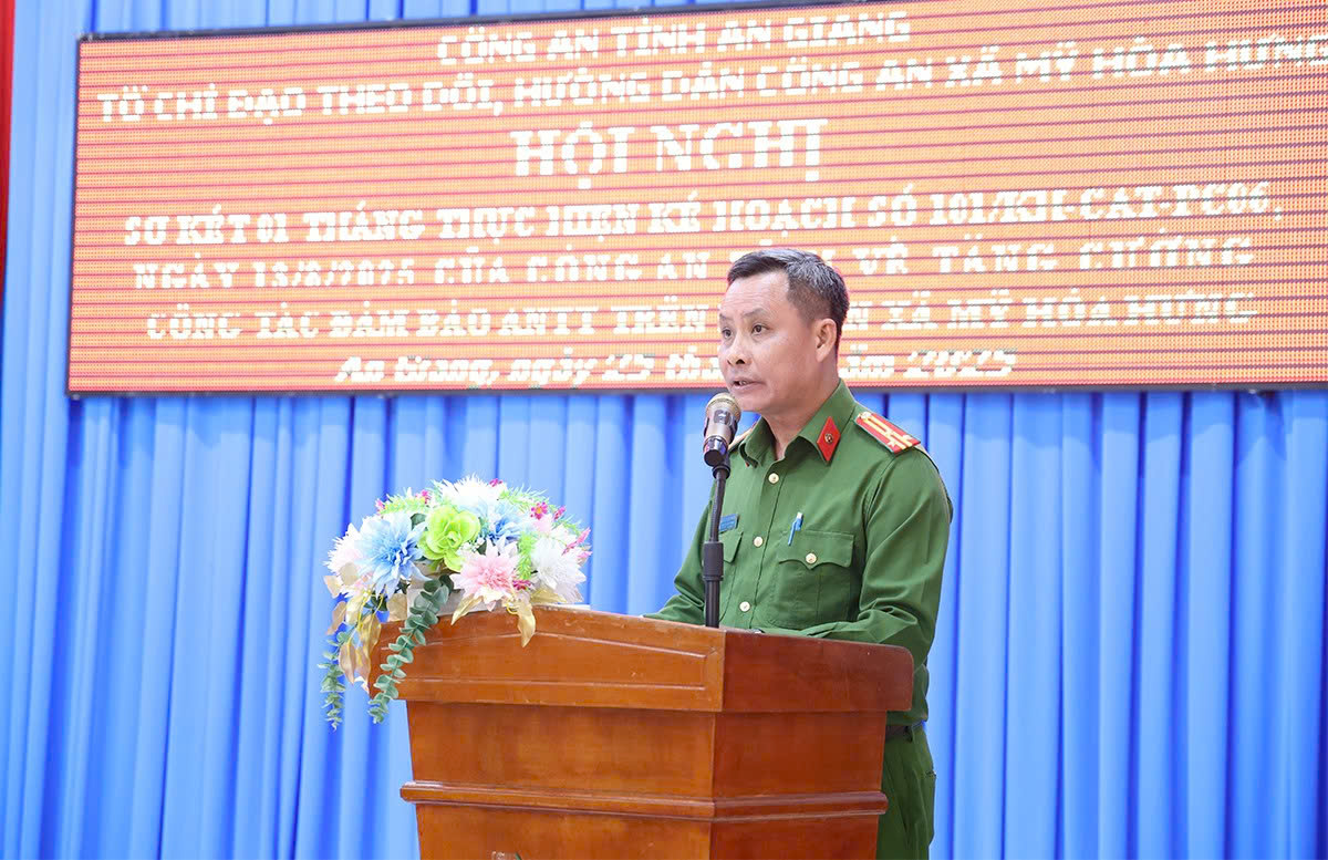 Sáng 26/9/2025, Công an tỉnh An Giang tổ chức Hội nghị sơ kết 1 tháng thực hiện kế hoạch của Công an tỉnh về tăng cường công tác đảm bảo an ninh trật tự trên địa bàn xã Mỹ Hòa Hưng. Đại tá Nguyễn Nhật Trường, Phó Giám đốc Công an tỉnh chủ trì Hội nghị; cùng tham dự còn có đồng chí Nguyễn Trung Nam, Phó Chủ tịch UBND xã Mỹ Hòa Hưng, đại diện lãnh đạo các Phòng nghiệp vụ Công an tỉnh và Ban Chỉ huy Công an xã Mỹ Hoà Hưng.