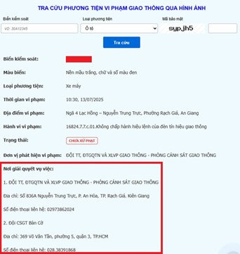 - Thực hiện “Tra cứu phương tiện vi phạm giao thông qua hình ảnh” bằng cách nhập biển kiểm soát, loại phương tiện, mã bảo mật, tra cứu nhằm xác định địa chỉ “nơi giải quyết vụ việc” cụ thể theo từng trường hợp để tiện liên hệ (có ảnh minh họa sau đây).