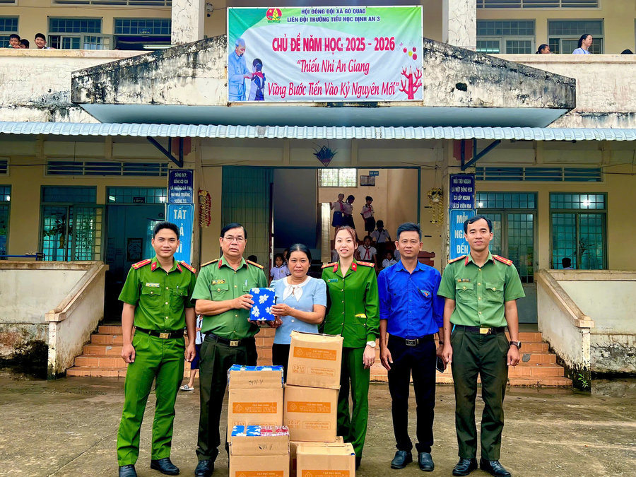 Song song đó, Phòng An ninh điều tra còn tổ chức chương trình “Tiếp sức em đến trường” tại Trường Tiểu học Định An 3, xã Gò Quao, tỉnh An Giang, đã tặng 1000 quyển tập đến các em học sinh có thành tích xuất sắc trong năm học 2024 - 2025.