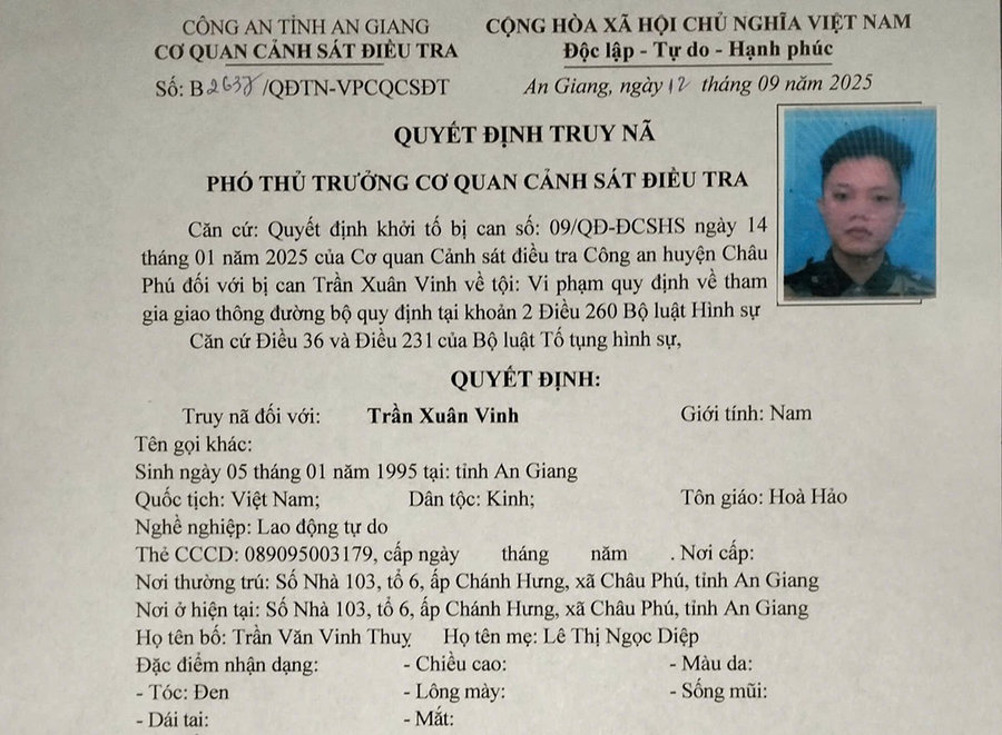 Sáng ngày 16/9, Cơ quan Cơ quan Cảnh sát điều tra Công an tỉnh An Giang cho biết vừa ra Quyết định truy nã đối với Trần Xuân Vinh (sinh năm 1995, cư trú tại xã Châu Phú, tỉnh An Giang) về tội “Vi phạm quy định về tham gia giao thông đường bộ”.